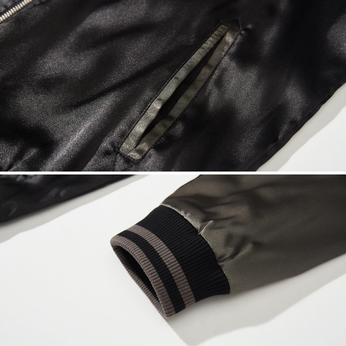 - High-Quality Material: The bomber jacket is made of heavyweight satin,which is cool and silky to the touch,and the high-density woven fabric is both soft and tear-resistant,not easy to snag,exuding luxury and retro charm under sunlight
