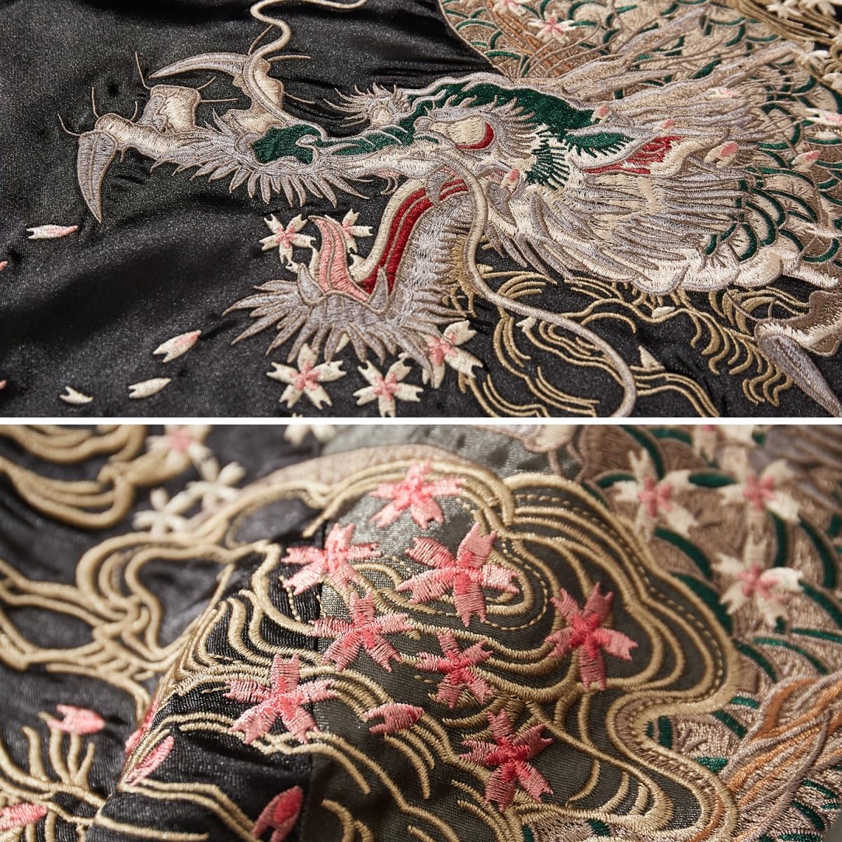 - Eye-catching Embroidery: The back of this sukajan jacket features a large embroidered design that is very eye-catching.The cyan dragon embroidery on this jacket represents the east (the place of sunrise), symbolizing absolute power and order, while the cherry blossoms, which blossom for only seven days, symbolize the splendor and transience of life. The combination of the two is a confrontation between power and mortality, but also a symbiosis between violence and beauty