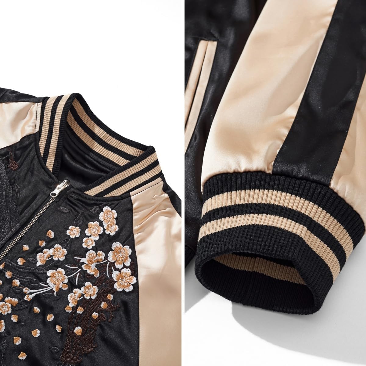 - Eye-catching Embroidery: The back of this varsity jacket features a large embroidered design that is very eye-catching.At the same time these embroideries have a unique symbolic meaning.The lion embroidery on this mens jacket symbolizes strength and resistance, while the cherry blossoms symbolize fleeting beauty and destiny, the combination of which expresses the need to fight even when you know the end is short