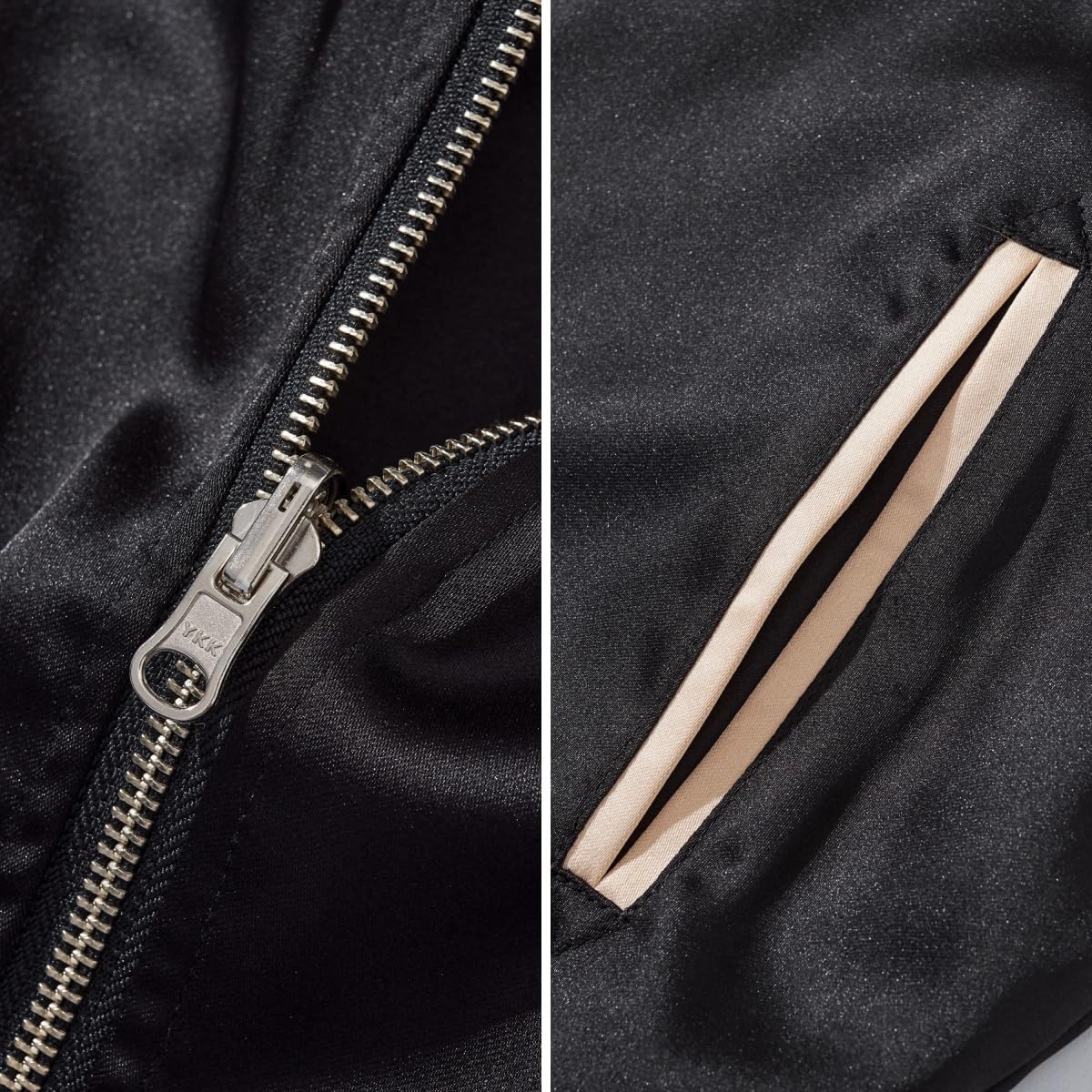 - High-Quality Material: The bomber jacket is made of heavyweight satin,which is cool and silky to the touch,and the high-density woven fabric is both soft and tear-resistant,not easy to snag,exuding luxury and retro charm under sunlight