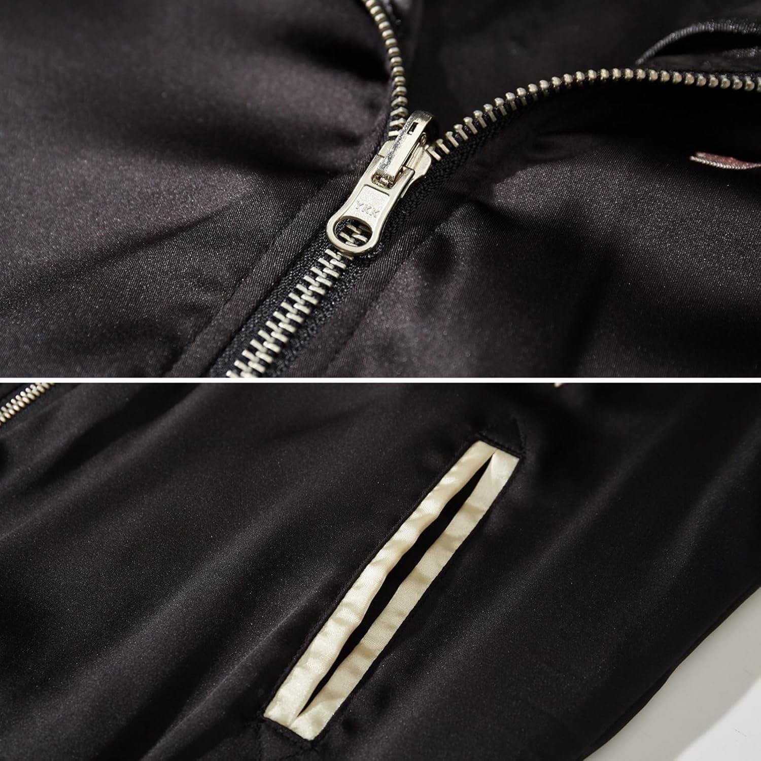 - High-Quality Material: The bomber jacket is made of heavyweight satin,which is cool and silky to the touch,and the high-density woven fabric is both soft and tear-resistant,not easy to snag,exuding luxury and retro charm under sunlight