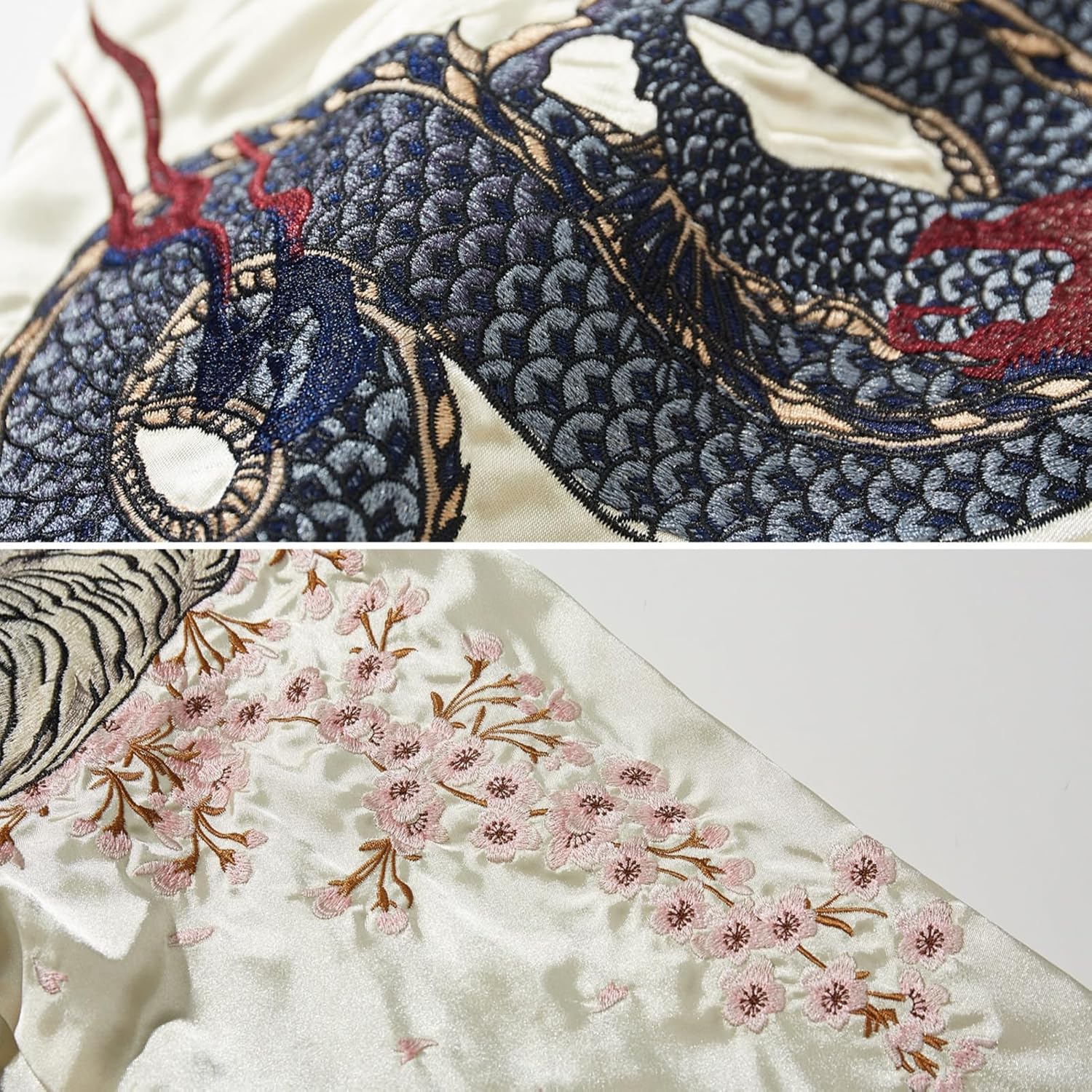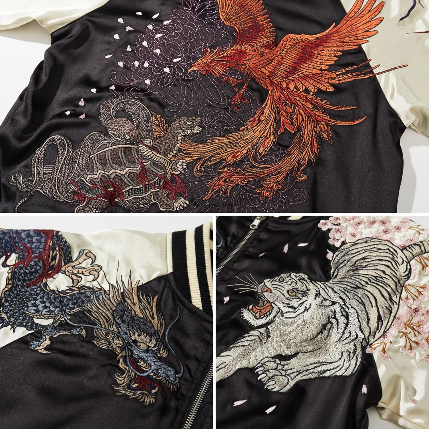 - Eye-catching Embroidery: The back of this sukajan jacket features a large embroidered design that is very eye-catching.The five mythical animals on this retro jacket symbolize the interplay of the five elements, the blue dragon and white tiger on the front symbolize the authority and force of the light, while the phoenix, turtle and snake on the back symbolize the wisdom and danger in the shadows, a metaphor for the jungle logic of street culture
