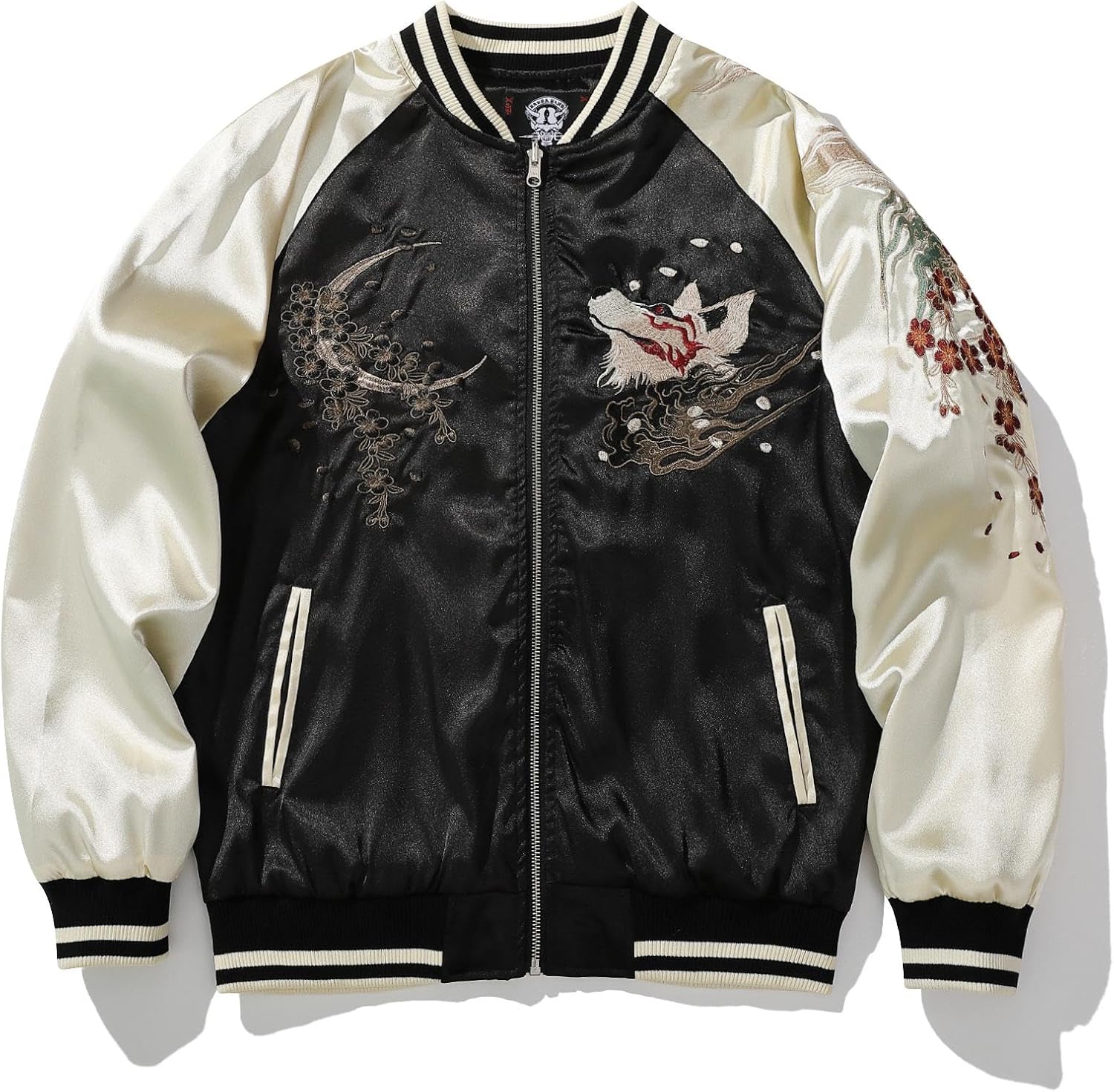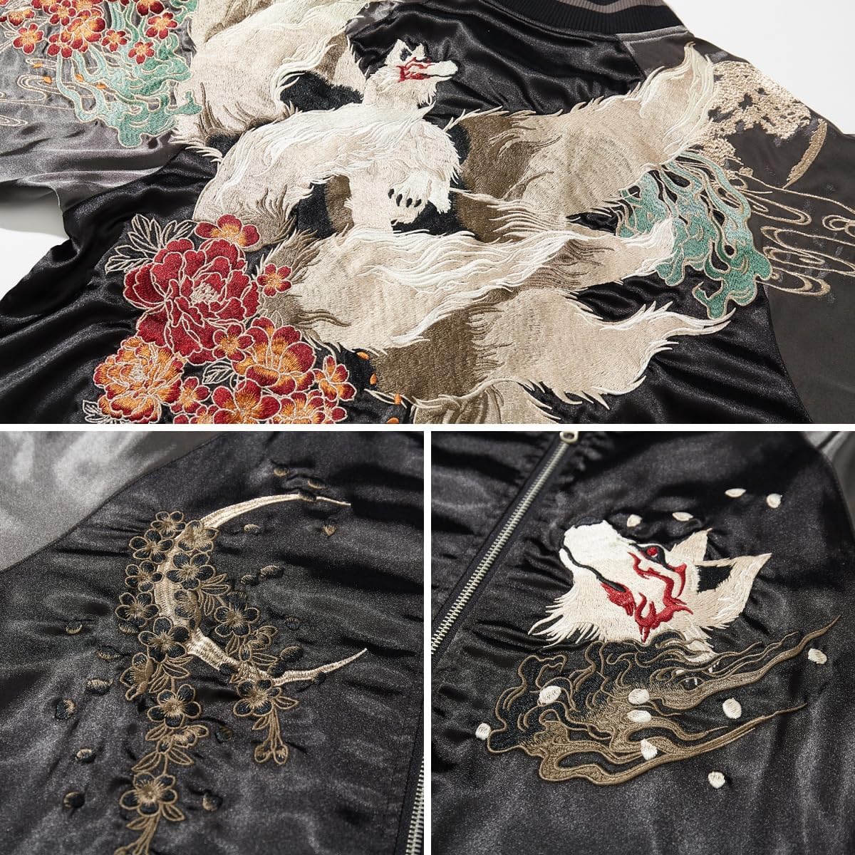 - Eye-Catching Embroidery: The back of this varsity jacket features a large embroidered design that is very eye-catching.At the same time these embroideries have a unique symbolic meaning.The embroidery of the nine-tailed fox has a unique meaning, symbolizing longevity, wisdom and strong spiritual power. These embroideries fulfill the Western imagination of the exotic Orient, while retaining the fine beauty of traditional Japanese art