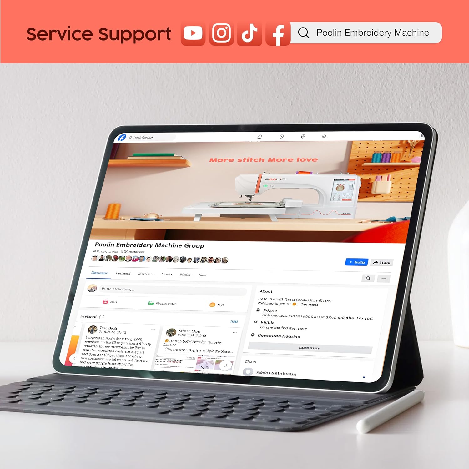- 【Personalized 1-on-1 training】Find us via multiple methods included in the box package. Join our ”Poolin Embroidery Machine Groups“ for expert tips and community support. Watch tutorial videos on YouTube by searching "POOLIN" for step-by-step guidance.