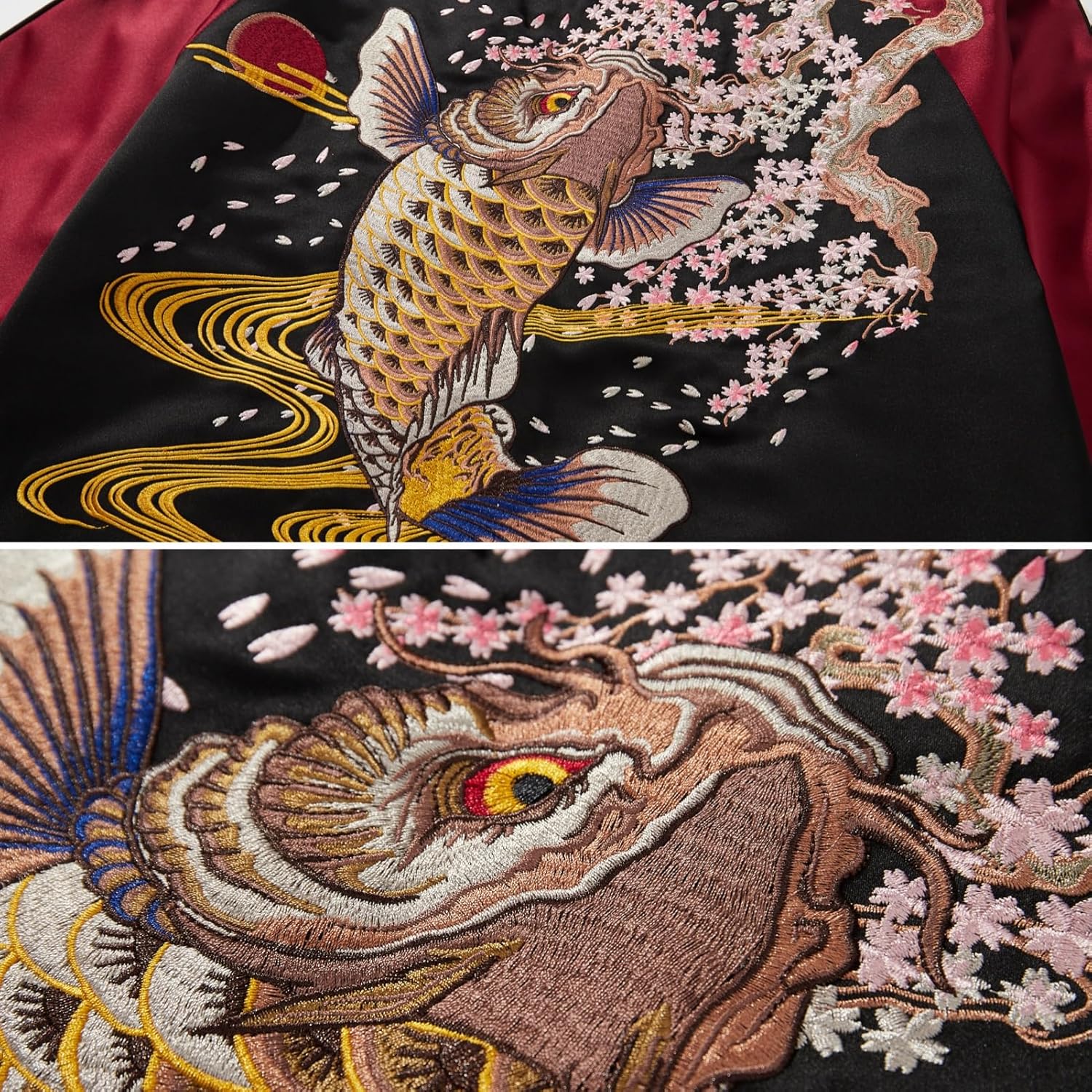 - Exquisite Eastern Aesthetics: The embroidery on this sukajan jacket has a very nice meaning.The koi carp and auspicious cloud motifs symbolize wealth, good luck and career advancement, and the cherry blossom motif symbolizes new beginnings.All of the embroidery is full of vibrant colors and vivid details